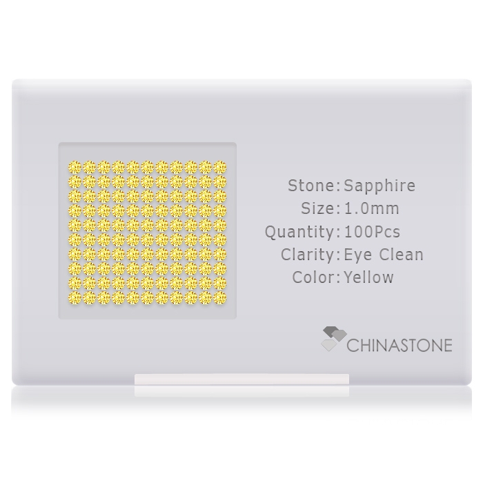 A perfectly calibrated lot of 100 high-precision cut natural Medium light greenish yellow sapphire gemstones from Africa, which are secured in a purpose-built box and accompanied by a Certificate of Authenticity. Each round shaped stone on average weighs 0.006 carat, measuring 1.00 mm in width, 1.00 mm in length and 0.65 mm in depth, and features an exceptional brilliant cut and finish, along with an absolute minimum variance of color difference.